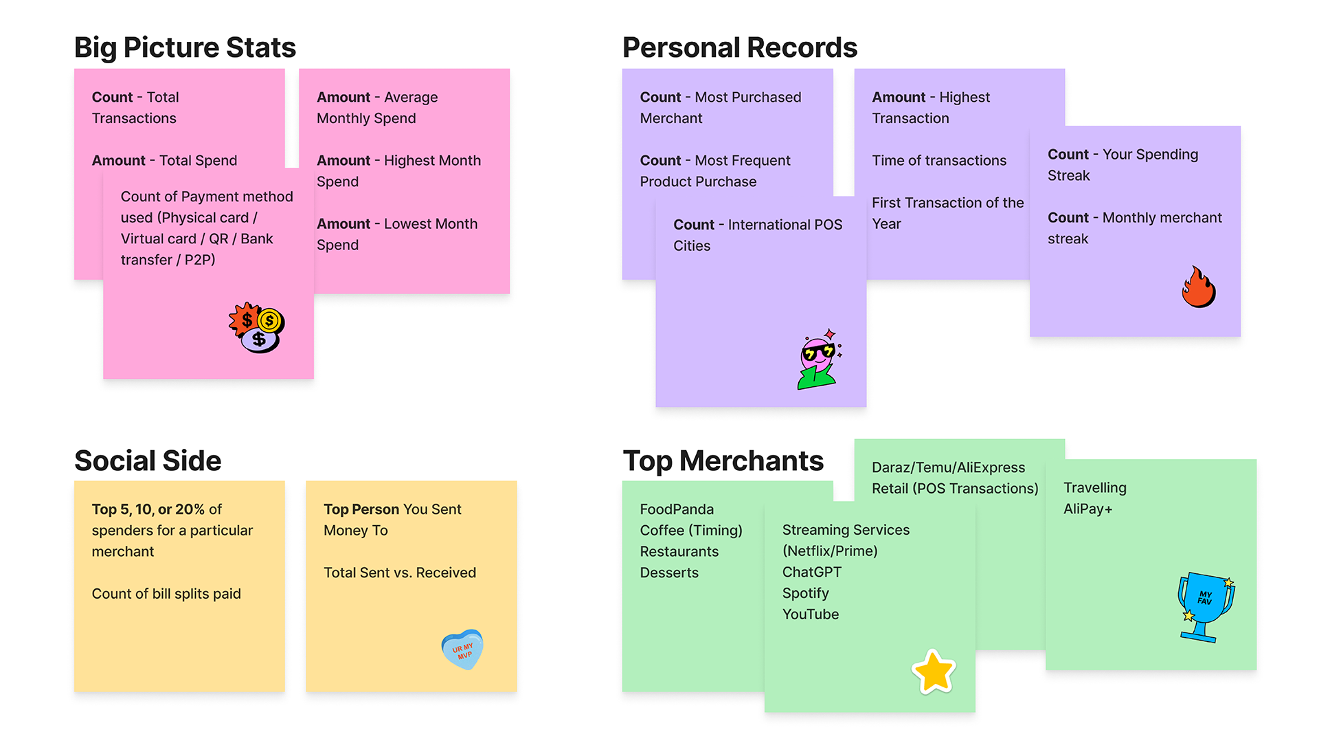 We started off by mapping out all the data points that could make your story interesting. Unsurprisingly, there were maaaany. Then came the big question: Does this apply to most users? Because even if a metric sounded fun, if it only applied to a tiny slice of the audience, it wouldn’t work at scale. After a lot of debate (and a lot of heartbreak for ideas we loved), we shortlisted nine core metrics that tell the most meaningful, relatable parts of your year. The ones that felt universal enough to give everyone a story, but specific enough to feel personal.